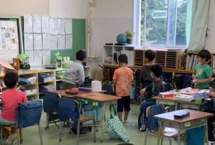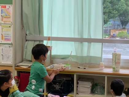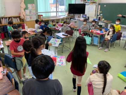生活科で作ってきた動くおもちゃの発表会です。グループごとに発表していきます。