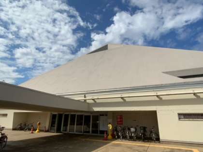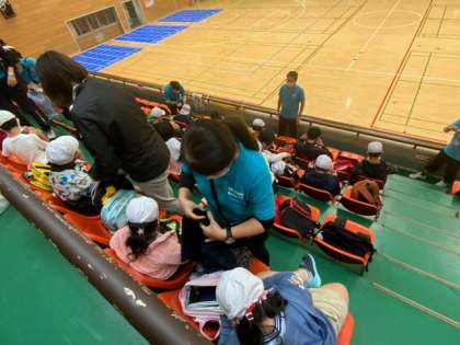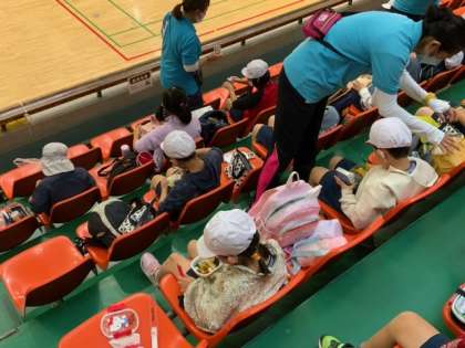 総合運動場の体育館に到着しました。まずは、お昼のお弁当です。
