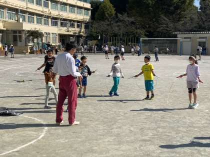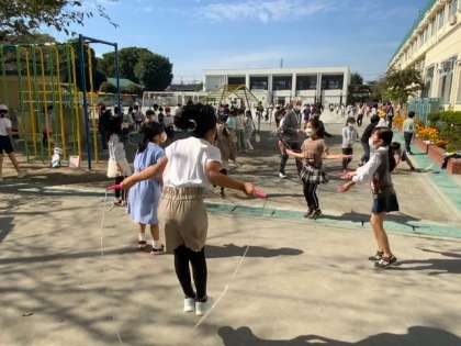 昨日に続いてとてもいい天気です。なわとびカードを手に、それぞれの記録に挑戦しています。
