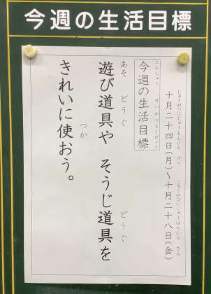今週の生活目標は「遊び道具やそうじ道具をきれいに使おう。」です。片付けだけでなく、使い方も考えていきましょう。