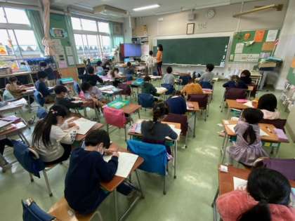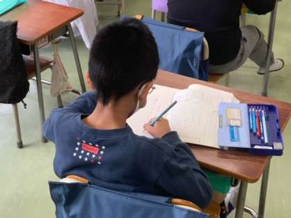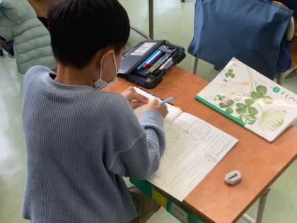 国語で日記などの書き方の学習です。題の書く位置や、1行目は、1マス空けることなどを確認しながら、ノートに書いていっています。