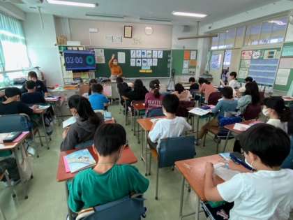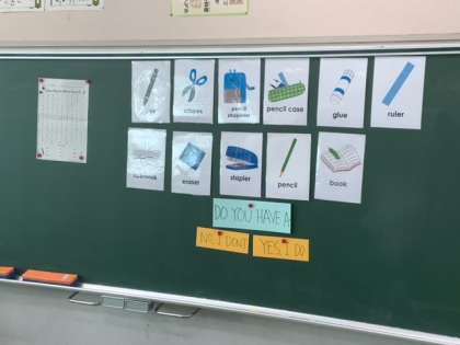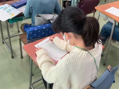 外国語活動で英語で出てきた文具の単語のつづりをアルファベットのたくさん並んだ表から探していきます。夢中になって取り組んでいます。