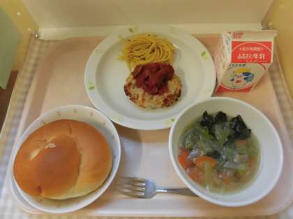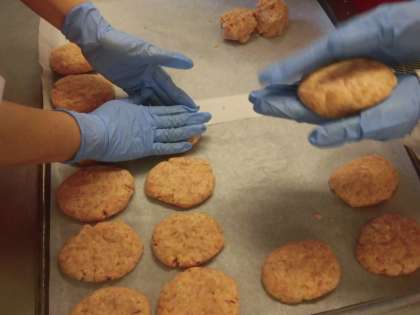 ☆今日の給食は「ヘルシーハンバーグ」です。みんなの栄養を考えて、ハンバーグ生地に、たくさんのおからを入れて、1つ1つ調理員さん達が心を込めて成形しています。