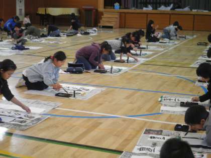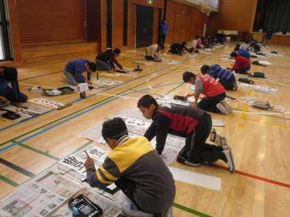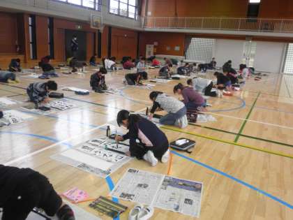 今日は、5年生が体育館で書き初めをしています。