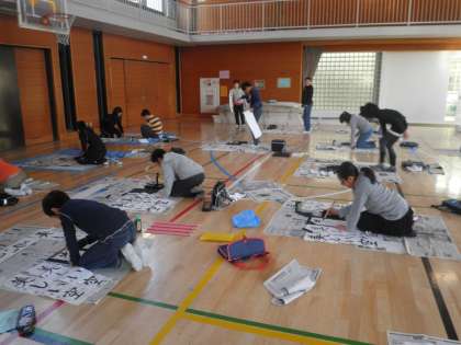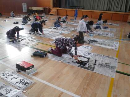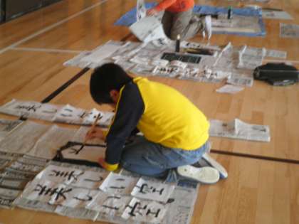 4年生の書き初めを見ました。寒い体育館で、みんな真剣に書き初めに取り組んでいます。