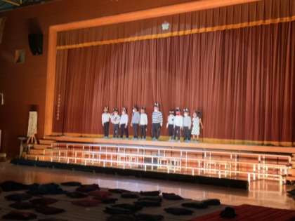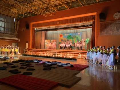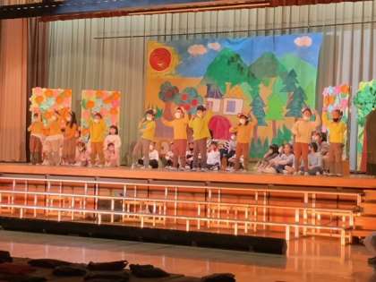 1年生は、「もりのおんがくかい」です。たくさんの動物たちが、歌を披露をしていきます。