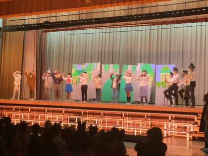 5年生は、「オズの魔法使い」です。照明、背景、音楽も子どもたちが大活躍です。歌がふんだんに使われています。