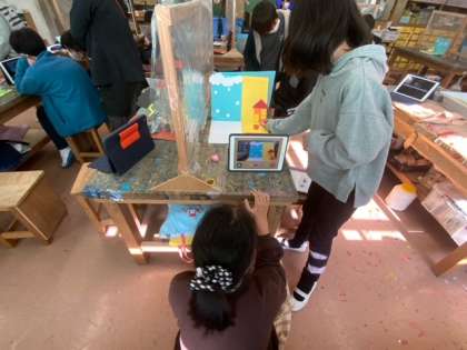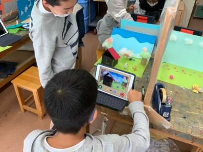 図工「マイキャラが動き出す」では、自分でつくったキャラクターをタブレットを使って撮影し、パラパラマンガのように仕上げていきます。一人で全部するには難しいので、友達に手伝ってもらいながら進めている子どももいます。