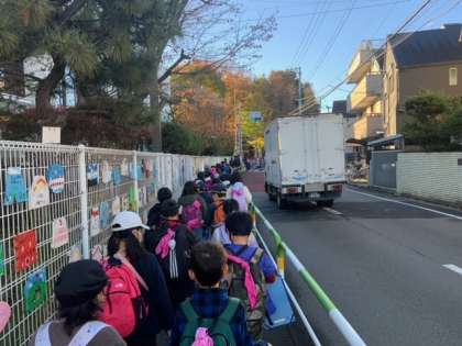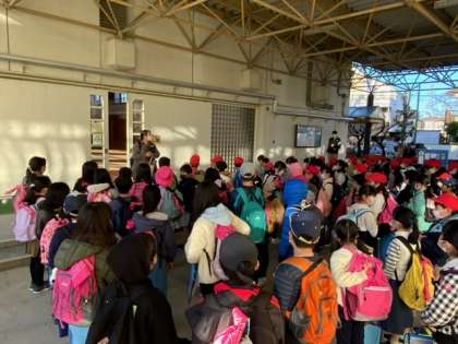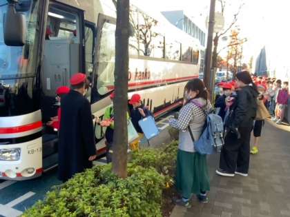 3年生とつくし学級3年生が、仙川駅で観光バスに乗って世田谷区内めぐりに出かけます。