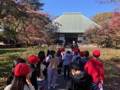 九品仏浄真寺に到着しました。環状8号線の渋滞が激しく、30分近く遅れての到着です。お坊さんが、各クラスにお一人付いてガイドをしてくださっています。子どもたちはメモをしながら聞いています。