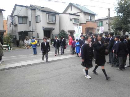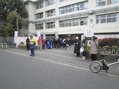 上祖師谷中学校では、烏山小学校の代表委員の児童と上祖師谷中学校の生徒、先生方そして保護者の方々が一緒になってあいさつキャンペーンに取り組んでいました。