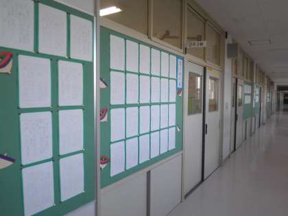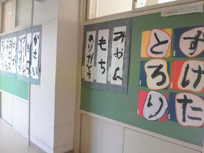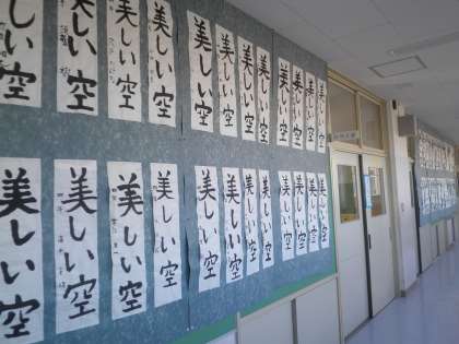 昨日(1月17日)から書き初め展が始まっています。低学年、高学年、つくし学級 それぞれそれの子どもたちが書いた書き初めが廊下に展示されています。