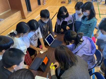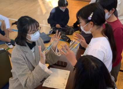 総合的な学習の時間で、アジアの国々からの留学生をお招きして、5年生が日本の文化を伝えたり、日本とアジア各国との違いを伝えたりしました。あやとりや福笑い、折り紙を留学生と楽しむグループもあります。