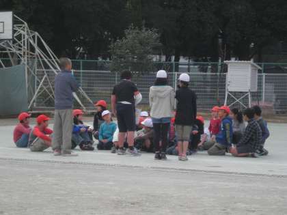遊びの最後は、きちんと集合して、今日の遊びの反省や挨拶をして終わります。6年生が良く動いていて立派です。