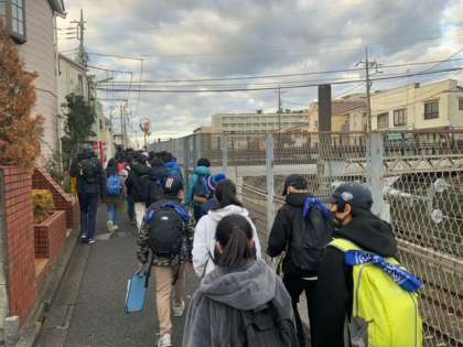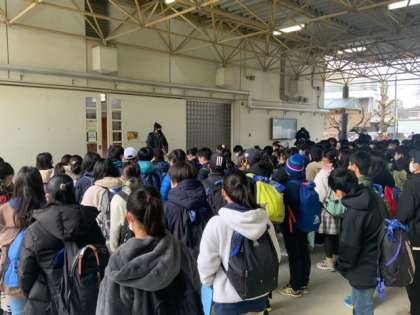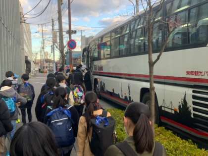 6年生とつくし学級の6年生は、社会科見学で鎌倉方面と「はまぎんこども宇宙科学館」へ向かいます。出発式を終えて、仙川駅から観光バスに乗り込んで出発です。