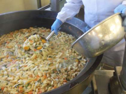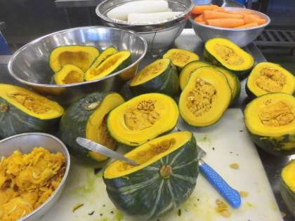 ☆今月の日本の郷土料理は、山梨県の料理「ほうとう風うどん」です。ほうとうと名付けられた由来は、武将の武田信玄が、戦で食べていた陣中食であり、自らの大切な刀で具材を刻んだことから、という説もあります。今日は、たくさんの冬野菜が入った、ほうとうを作りました。