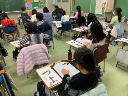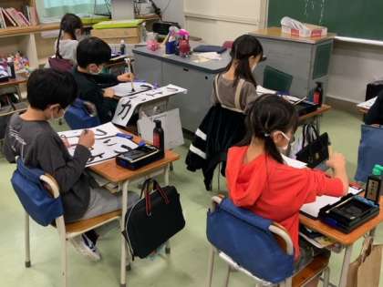 書写で「つよい力」を書きます。姿勢を整え、気持ちも整えて、集中して書いていっています。