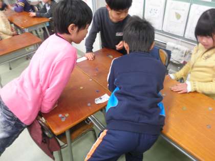 1年生が生活科の学習で昔の遊びをしていました。おはじきをみんな真剣になってやっています。学校で初めてやった子も多く、今は、おはじきに夢中です。