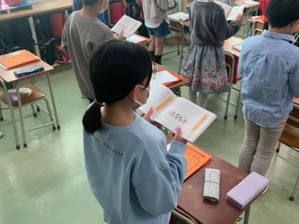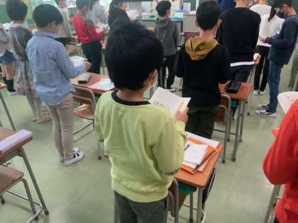 音読の宿題でも取り組んだ「祝詞」を皆で一緒に音読し、最後は自分の気に入った「おめでとう」のことばを言いました。