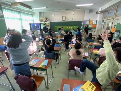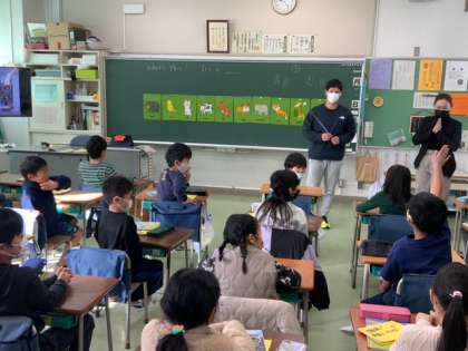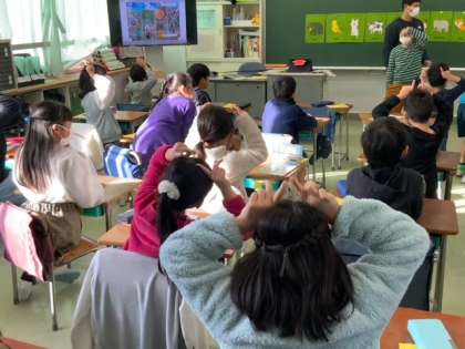 外国語活動で、英語で「What's it?」それは何かを問います。それを皆がジェスチャーで伝え、答えます。cow(牛)とdeer(鹿)を区別してジェスチャーをすることに苦労しつつも楽しく取り組みました。