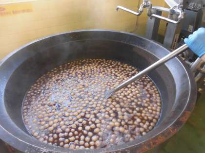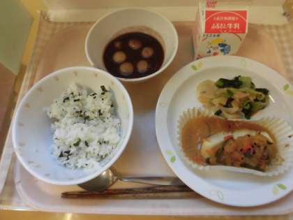 ☆今日から3学期の給食がスタートしました。今日は鏡開き給食です。給食室では、大釜に小豆と砂糖を入れて時間をかけてやわらかく煮て、白玉しるこをつくりました。