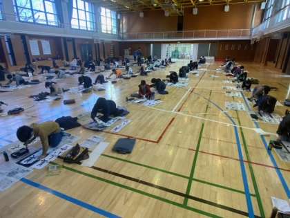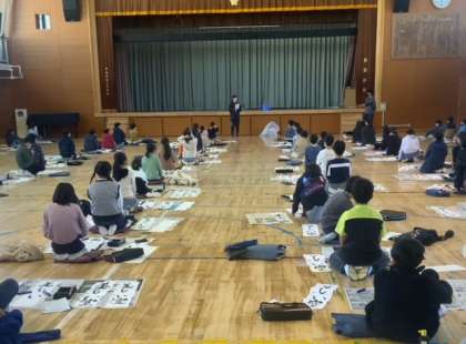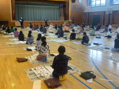 体育館で学年で、席書会に取り組んでいます。姿勢を正し、真剣に取り組んでいます。