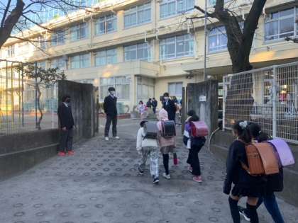 登校時に上祖師谷中学校の生徒たちが烏山小学校の2箇所の門に立ち、あいさつを呼びかけました。烏山小学校からも代表で上祖師谷中学校に出向いています。