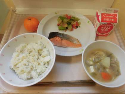 今日の給食は、昔の給食をイメージして作っています。特に雑穀ごはんには、麦 ひえ あわが入っていて、栄養価の高い物になっています。豚汁に入っている、長葱と大根は世田谷区で収穫したものを使いました。
