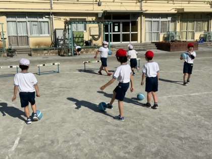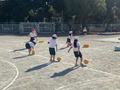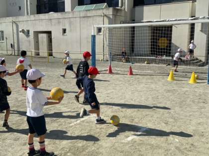 体育で、ボールを蹴る学習をしています。様々な的をめがけて蹴ります。順番に各コースを回ります。