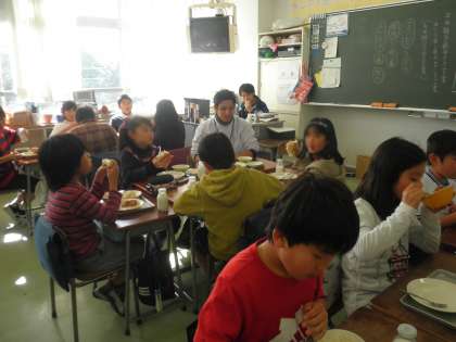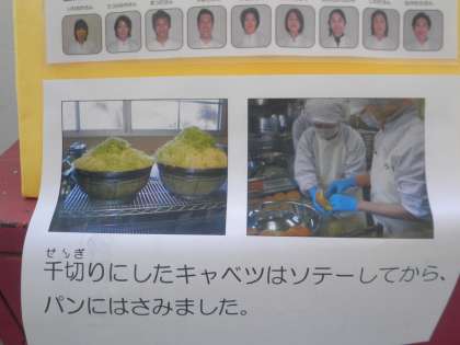 今日は、給食週間最終日です。毎日調理員さんたちが、いろいろなクラスに行って会食をしました。また、ほぼ毎日給食室の調理の様子を、栄養士さんが二階、三階の廊下に掲示しています。給食を作る様子がよく分かります。