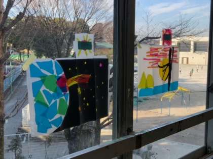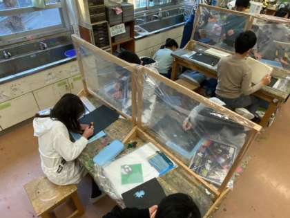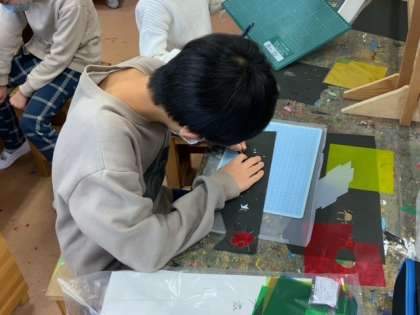 図工「すてきなあかり」で、黒画用紙をカッターナイフで切って、ランプシェードをつくっていきます。カッターナイフの安全な使い方を確認した後、見本を参考にしてどんどんつくり進めています。