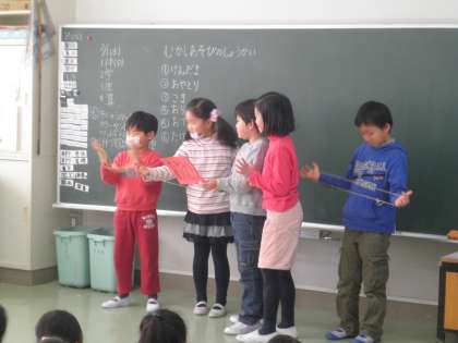 2年1組が1年1組を招待して、昔の遊びの紹介をしていました。あやとりやこま、折り紙などをグループごとに紹介しています。1年生は、楽しそうに見ていました。