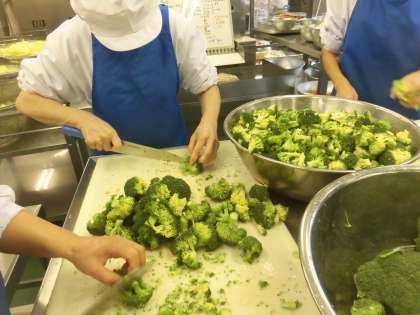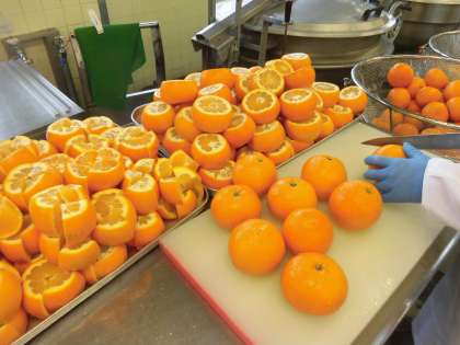 ☆今日の果物は「いよかん」です。愛媛県で栽培され、愛媛県伊予市の地名をとって昭和になり「いよかん」と名前がつけられました。給食室で、たくさんのいよかんを包丁で1/4カットしています。