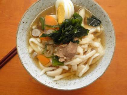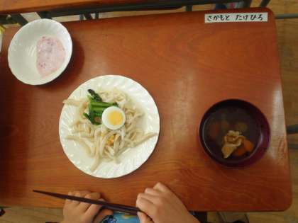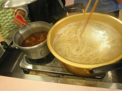 できたうどんを調理します。ゆでたては、おいしそうです。2種類のうどんができました。