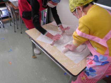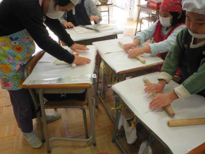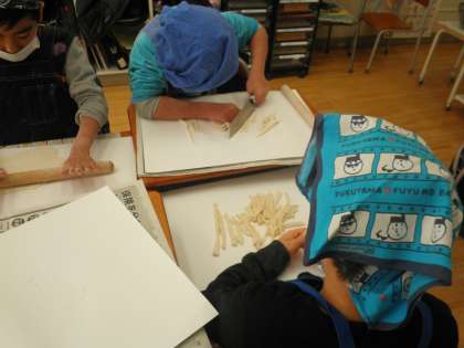 今日は、つくし学級の調理実習です。昨日5,6年生が練った小麦粉を麺棒で伸ばして、細く切り、うどんを作ります。みんな楽しそうに麺棒を使っています。