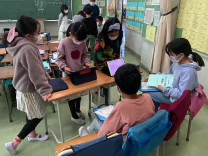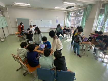 総合的な学習の時間で調べてきたことを発表しています。自分たちで調べた寺町などの発表内容からクイズを作って出題するなど工夫して発表しました。