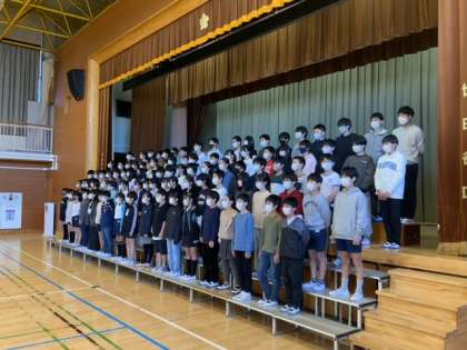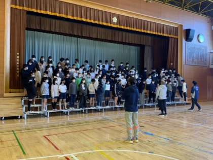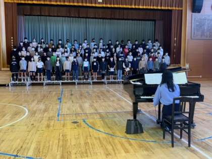 学年での音楽で「一本の樹」を歌いました。この曲は烏山小学校の150周年を祝う上で大切にしていく曲です。学年で気持ちを合わせ、気持ちを込めて歌っています。この曲を在校生に引き継いでいきます。