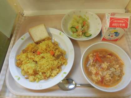 *今日の給食は「アクアコッタ」です。イタリア トスカーナ地方の郷土料理です。イタリアでは固くなったパンをスープにつけて食べる習慣があります。今日の給食では、食パンをオーブンでカリカリに焼いて、スープにつけて食べました。