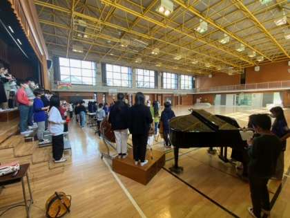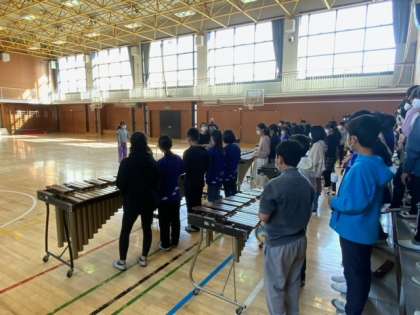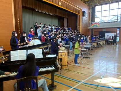 6年生を送る会の6年生からの演目の合同練習です。合奏の練習をしています。真剣に取り組む姿がたくさん見られ、嬉しくなりました。