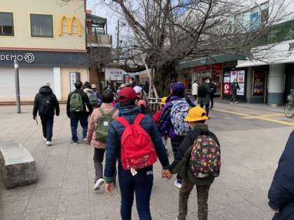 つくし学級全員で、羽根木公園へ遠足です。教室でめあてを確認して仙川駅をまずは目指します。先生のお話しをよく聞いて、並んで道路を安全に歩くことができています、
