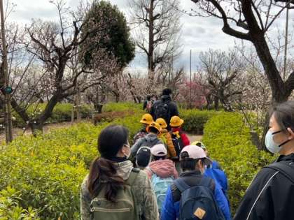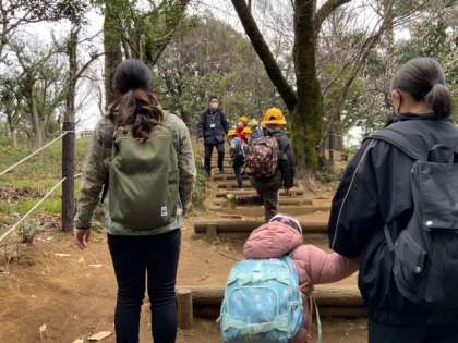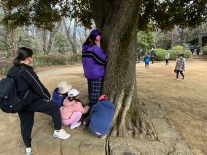 園内を散策して、プレーパークでかくれんぼをして皆で遊わでいます。