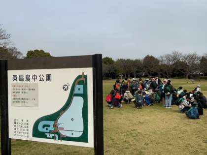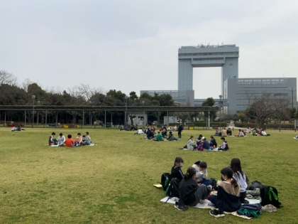 川崎マリエン近くの東扇島中公園でお弁当です。曇って少し風が吹いていますが、雨に降られなくてよかったです。
