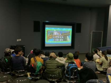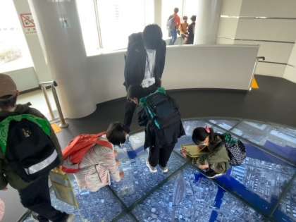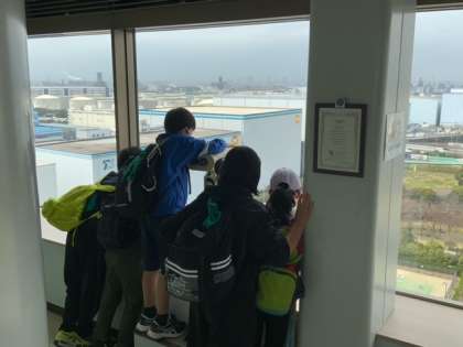 川崎マリエンの施設内を見学しています。遠くがよく見えて、解説や望遠鏡もあります。シアターでは、川崎港の船やトラックによる物流などについて、映像で学びました。
