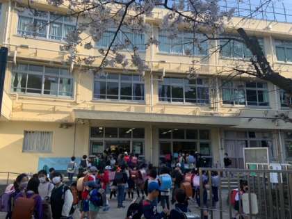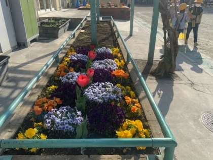 東門の桜が見頃となってきました。校庭の花壇も花盛りです。