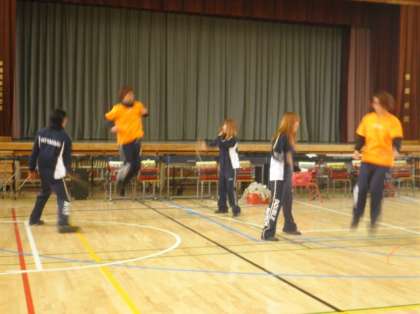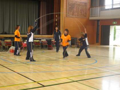 日本体育大学のダブルダッチのグループ「アーカイブ」がデモンストレーションをしてくれました。とても上手です。そのあと、跳び方と縄の回し方を説明してもらいました。