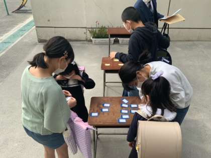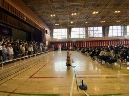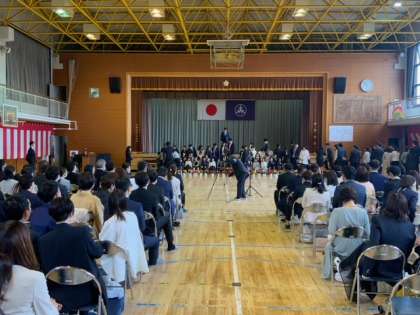 76名の新入生です。6年生が優しく教室まで案内をしています。6年生と2年生からの歓迎のことばもとても素敵でした。
