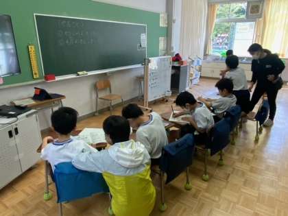 各学級で4月のカレンダーを書いたり、社会科の勉強をしたり、日直の役割を確認したりしています。