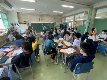 国語の「つないでつないで一つのお話」で、友達と協力してお話がつながるようなストーリーを考えていきます。とても楽しく取り組んでいます。