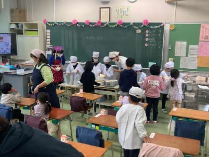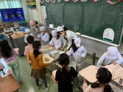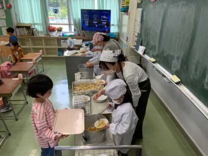 保護者の方のサポートをいただきながら、給食の配膳をすすめています。日に日に上手になってきています。