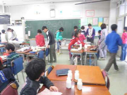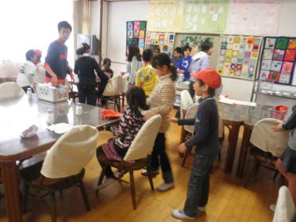 今日は縦割り班の交流給食です。高学年の子を中心に準備を進めています。高学年の子は、低学年の子に声をかけながらどんどん作業を進めています。